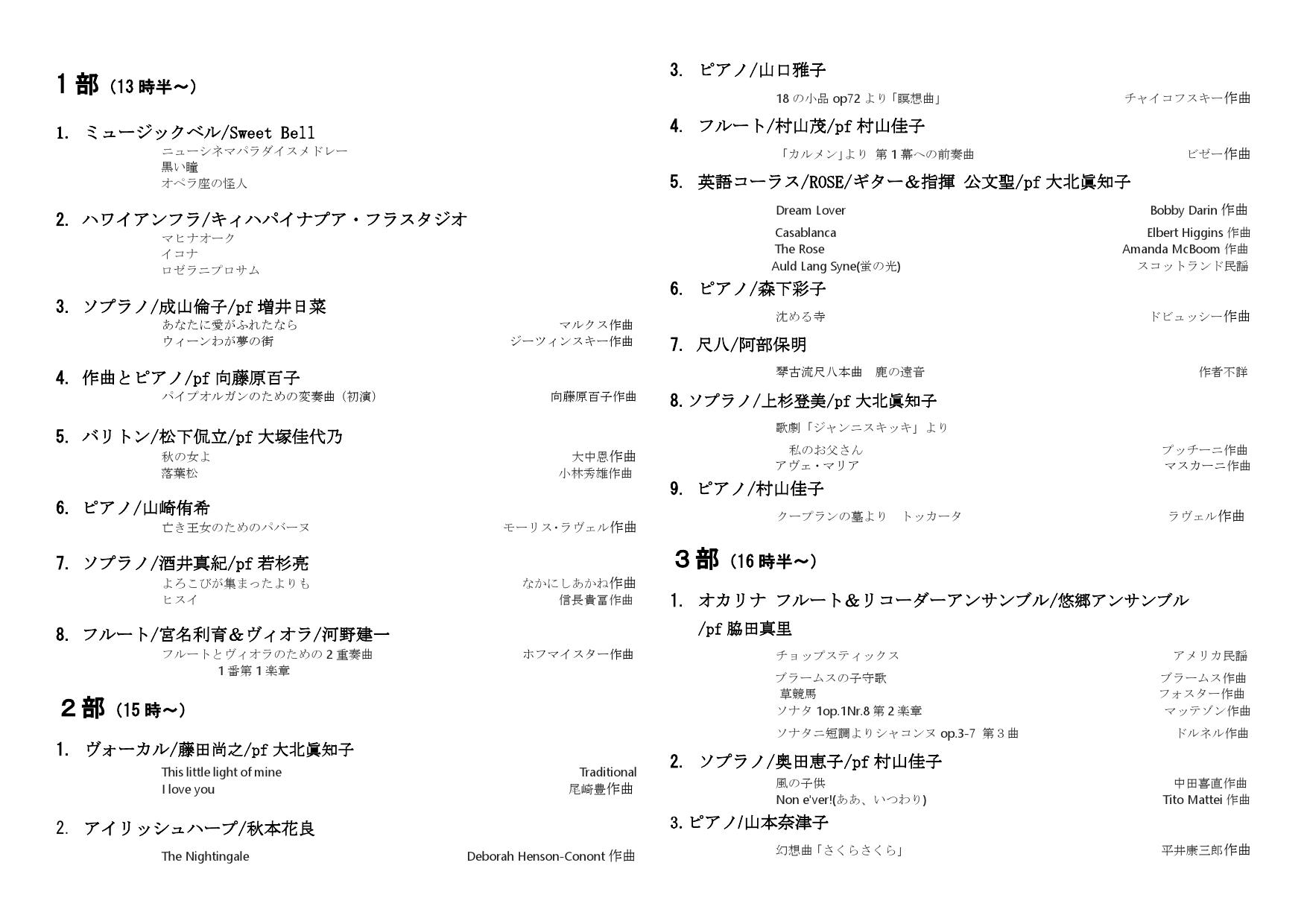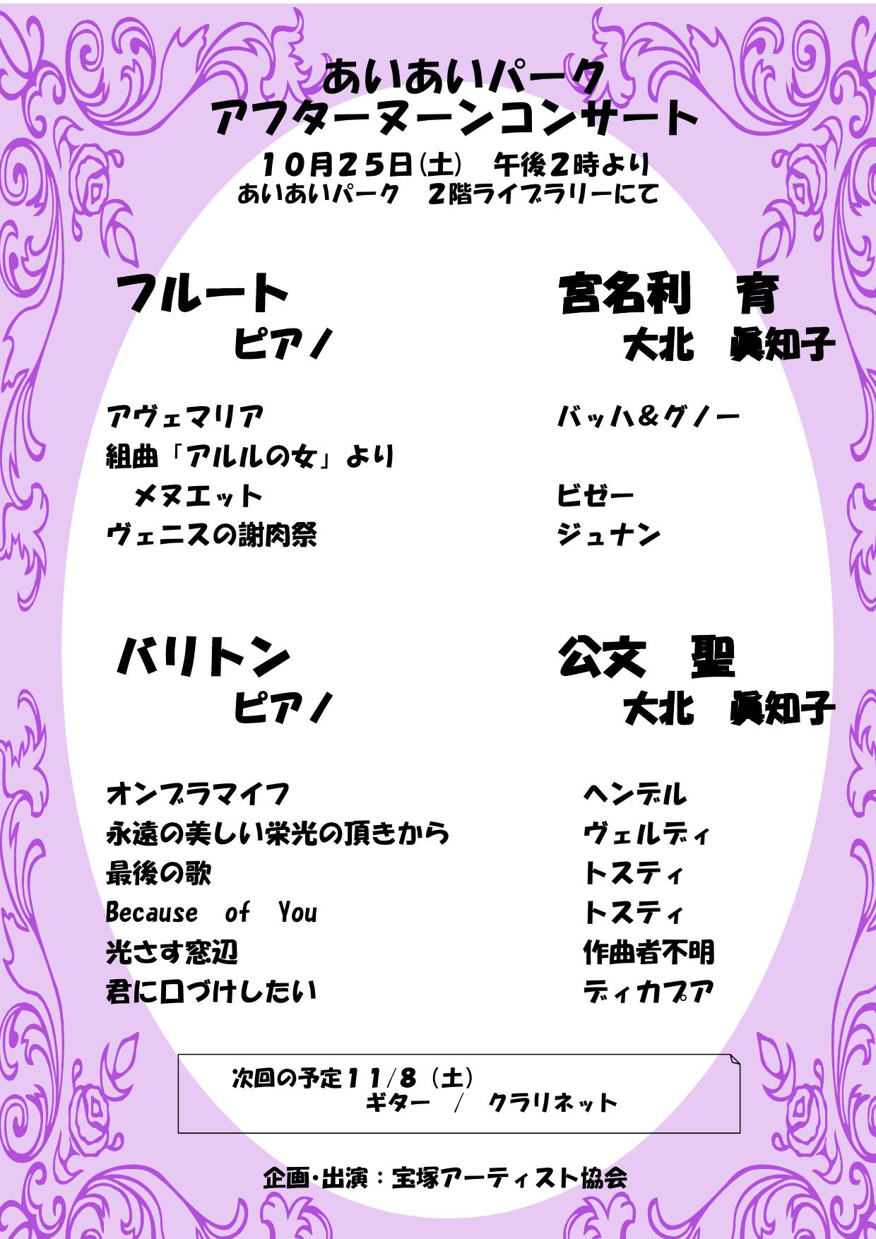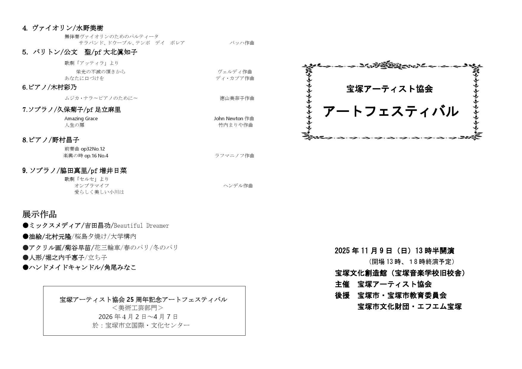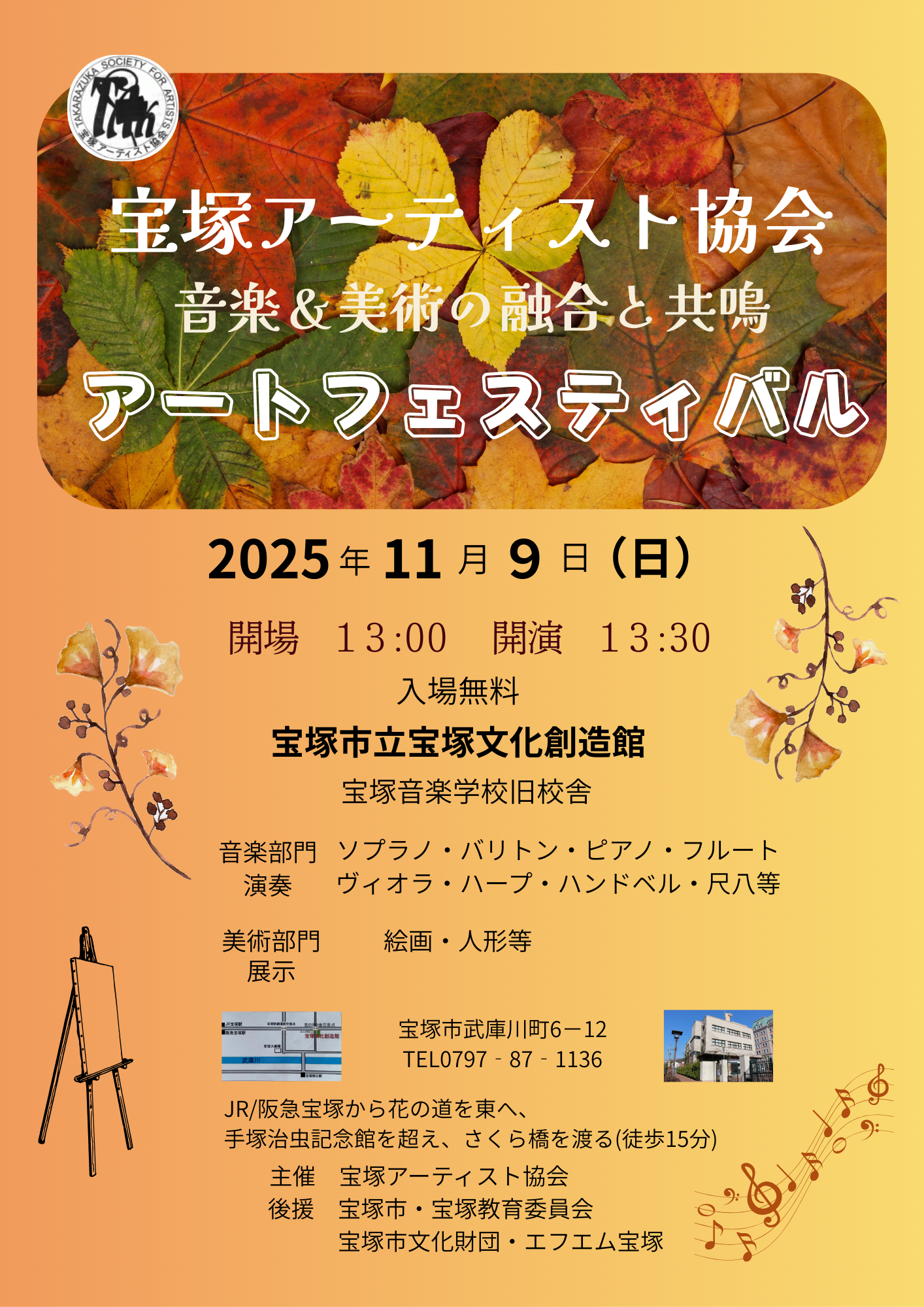 主として宝塚で活動するアーティスト及びその集団を会員とし、各種市民団体、福祉関連諸団体などの要請に応えて、演奏会や展示会などをコーディネートし、質の高い芸術を提供する事により文化・芸術・福祉の振興を図り、社会貢献することを目的とします。 |